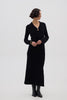 Featuring a deep V-neckline with a keyhole detail, this long wool dress is sleek and refined, while the ribbed knit texture creates a flattering, body-skimming fit. The midi length and minimalist silhouette allow for easy pairing with boots, tailored coats, or structured blazers, making it a wardrobe essential for effortless styling.