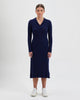 The Queenie Knit Dress in Navy effortlessly combines comfort and sophistication. This merino wool dress features vertical cable detailing and a lapel-style collar, adding an elegant touch to this versatile knit dress. Perfect for any occasion, it provides warmth and style in premium Australian Merino Wool.
