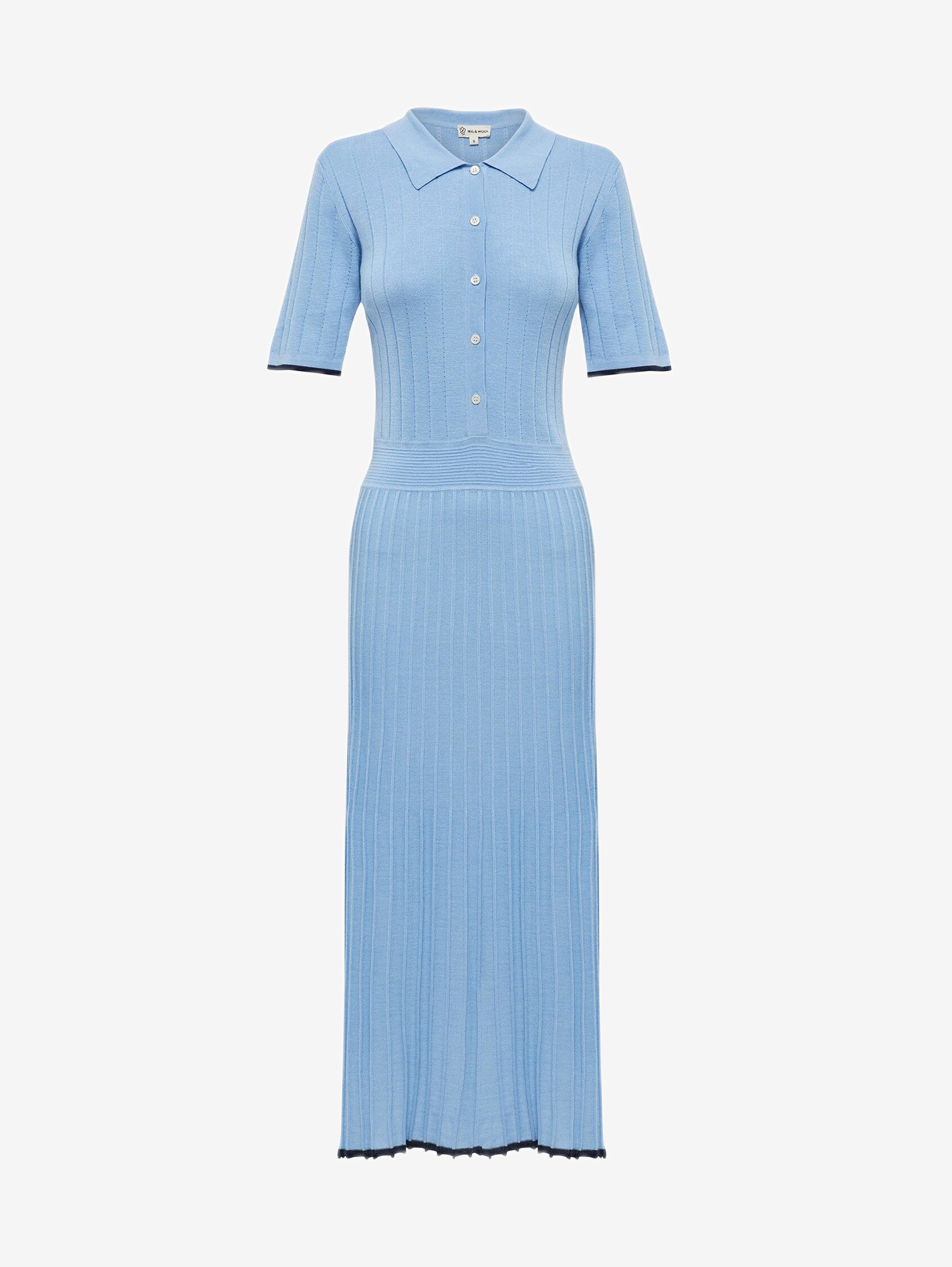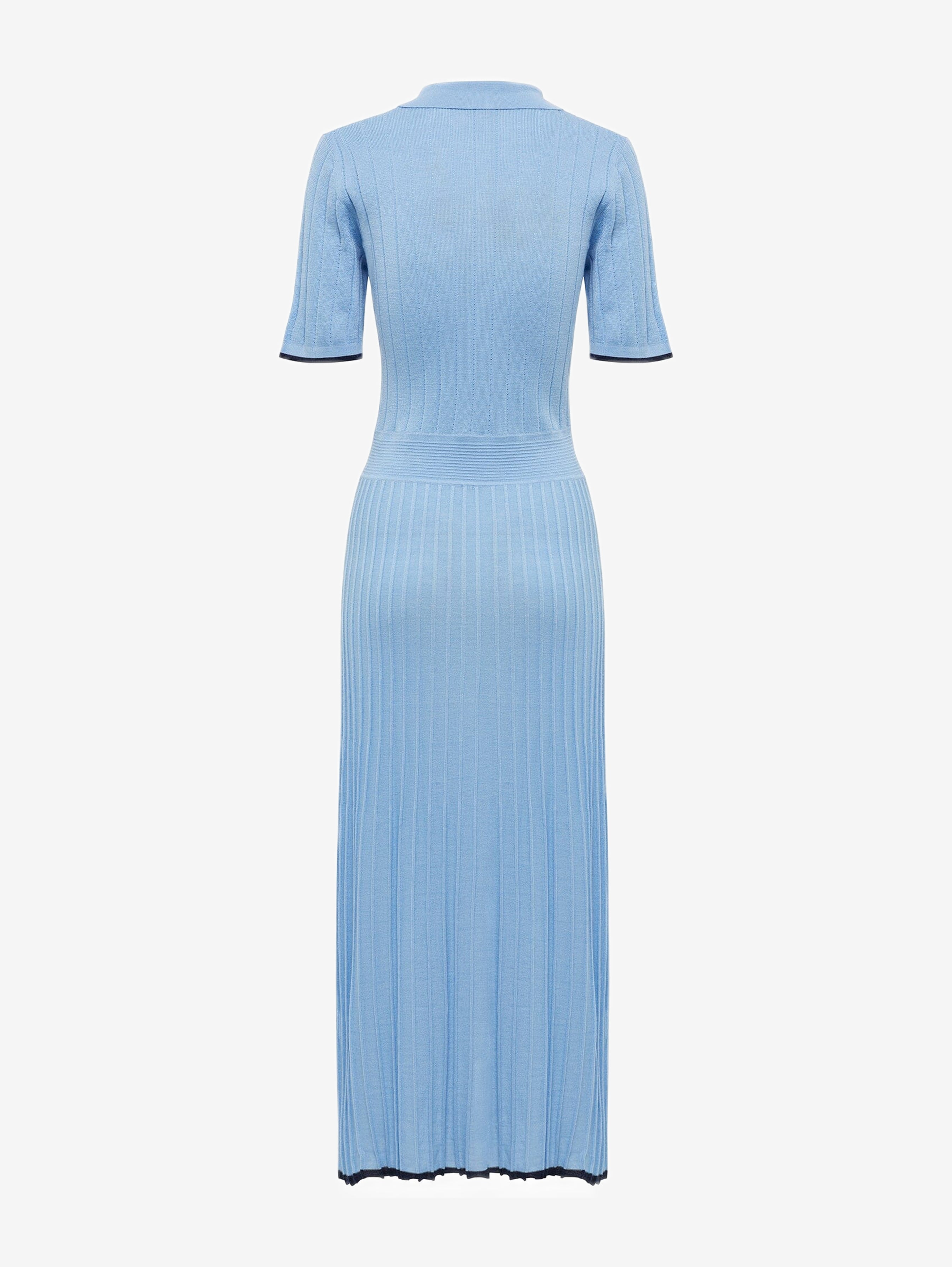 Embrace a blend of sporty and refined style with the Cate Polo Dress in Sky Blue. This knit dress offers a lightweight, knitted design featuring a polo collar, tipped hem, and mother-of-pearl buttons. Perfect for casual outings or dressed-up occasions, this merino wool clothing piece is a fresh addition to your womens knitwear dress collection.