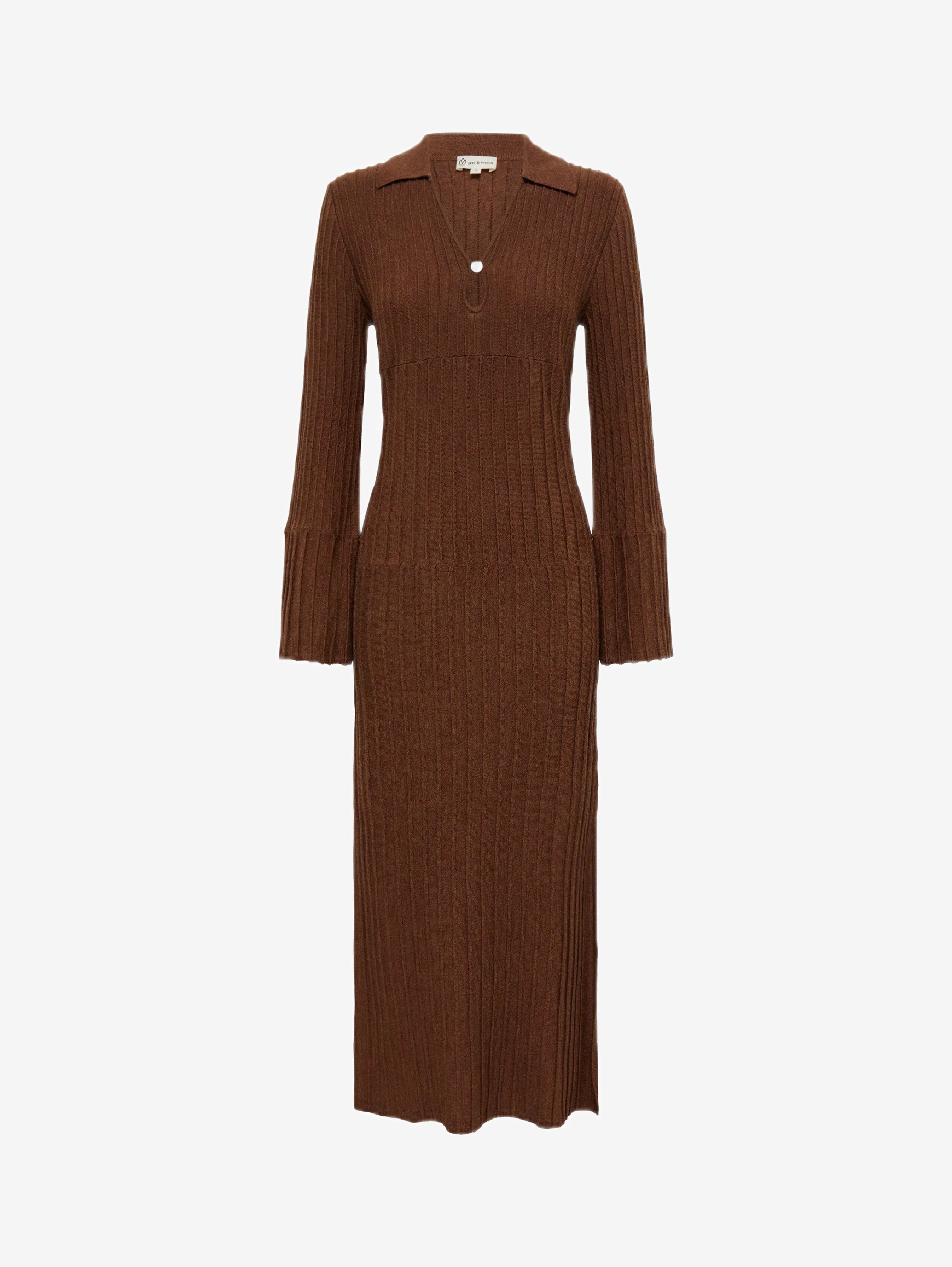 Designed with a deep V-neckline and keyhole detail, this Merino dress creates a sleek, elongating silhouette, while the ribbed knit texture adds dimension and structure. Its midi length and fitted shape make it ideal for layering, pairing perfectly with boots for a refined yet effortless look.