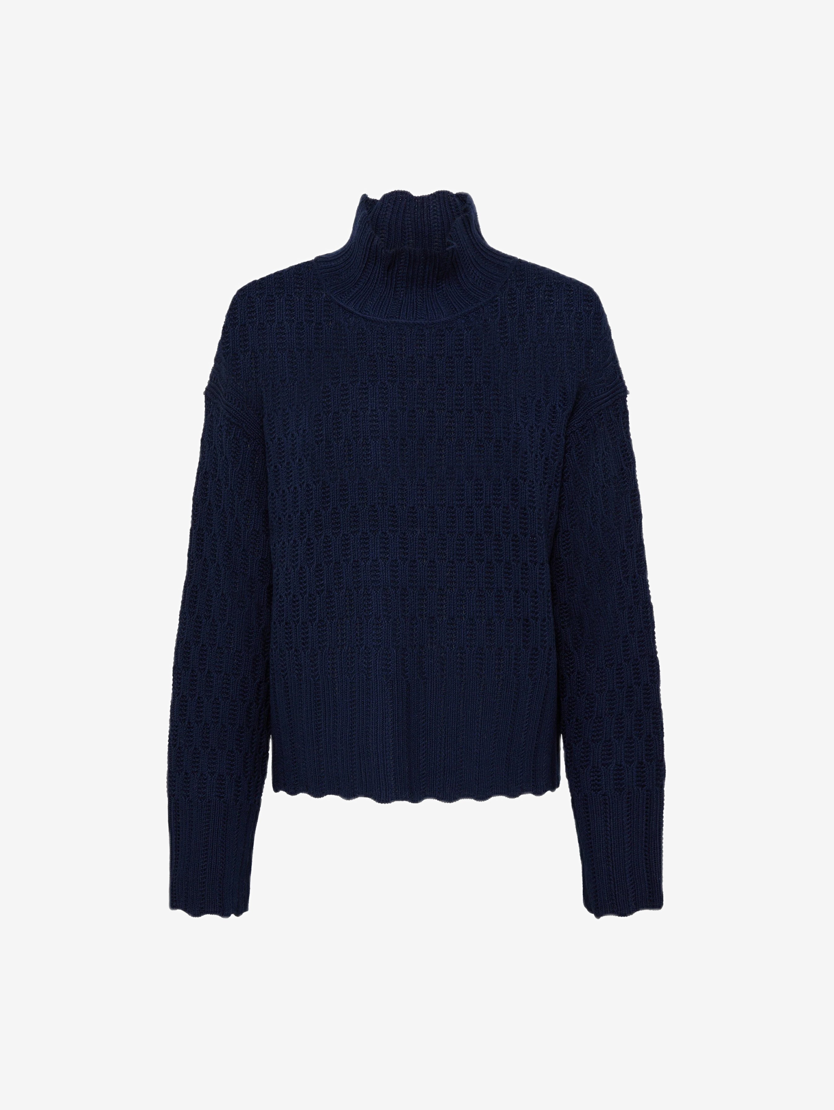 Designed with a high mock neck and a beautifully textured open-knit pattern, this ladies wool jumper creates a polished yet relaxed fit. The ribbed cuffs and hem add structure, making this pure wool sweater ideal for pairing with jeans for a casual look or tailored pieces for a refined finish.