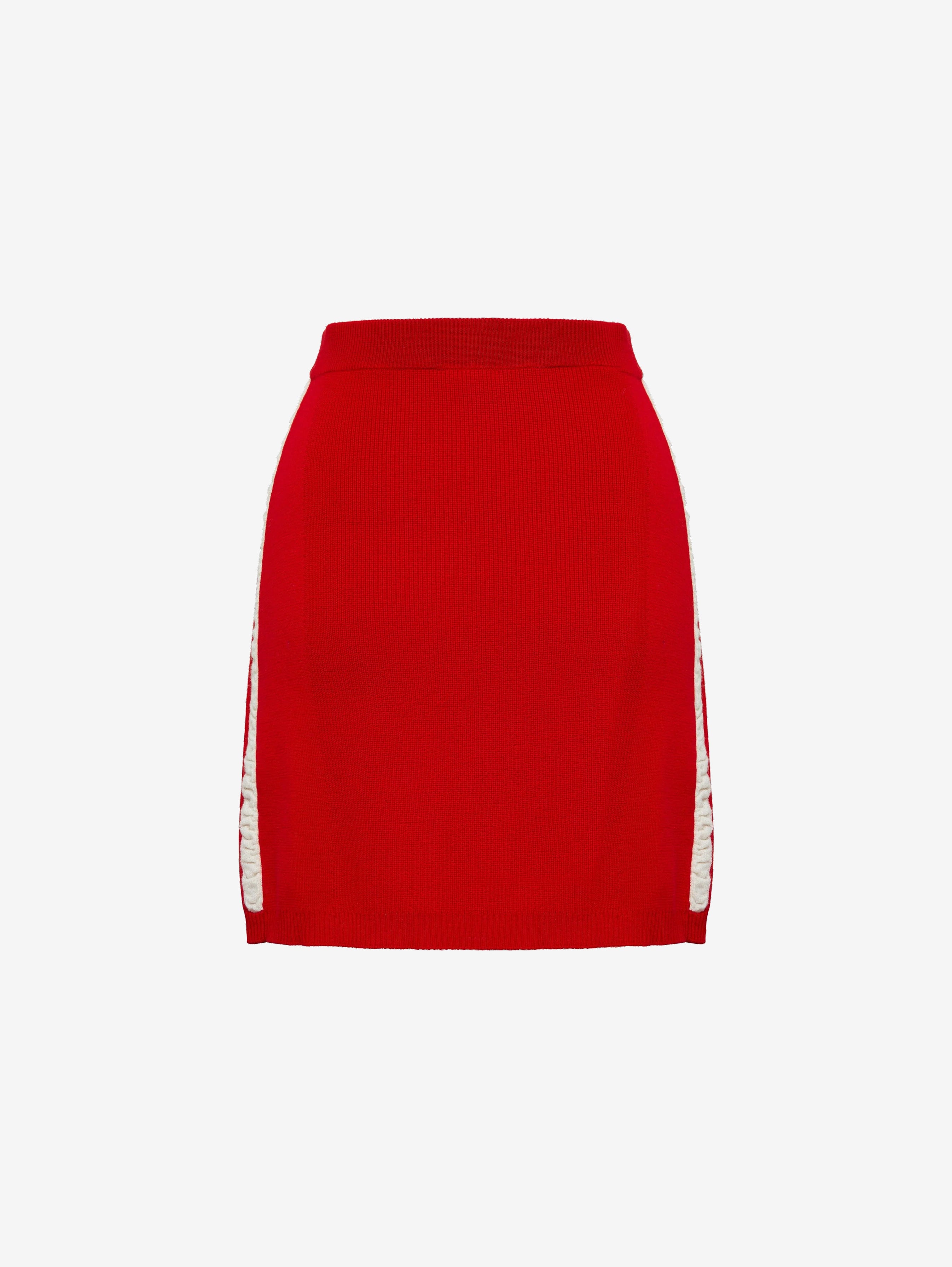 With cream contrast stripes along the sides, this wool skirt brings a sporty yet refined twist to a classic fitted mini silhouette. Whether paired with a blouse for an elegant touch or styled with the matching sweater for a coordinated look, this skirt is a standout piece for any occasion.