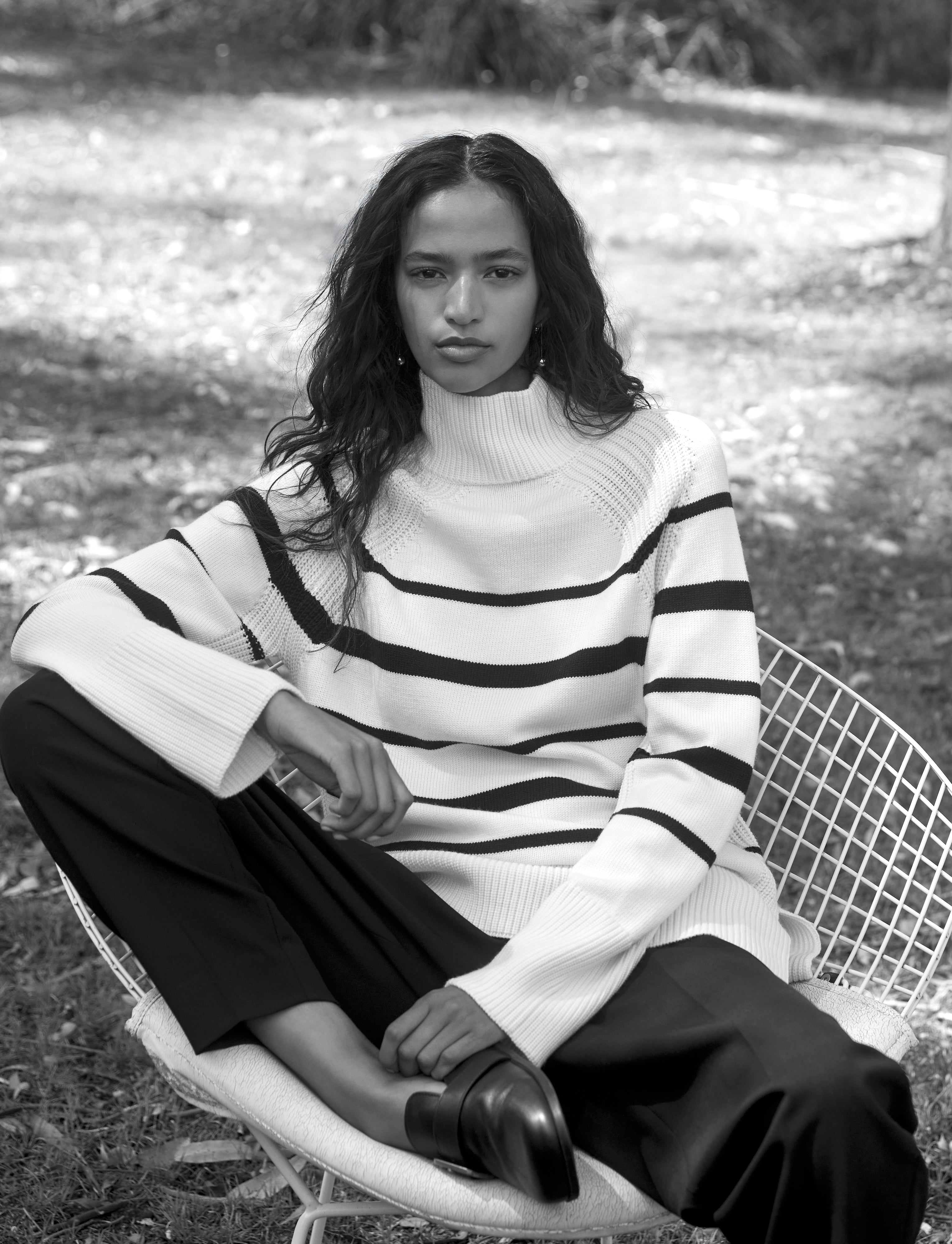 Classic knitwear motifs, including harlequin checks, scaled-up argyles, stripes and fair isle designs are given a fresh perspective through a play on proportions and lend a graphic refinement to the collection's tactile base. True to the Iris & Wool signature, detail is where the collection deepens. Asymmetrical lines, whipstitch trims, crochet buttons and delicate piping offer intrigue in the smallest gestures.