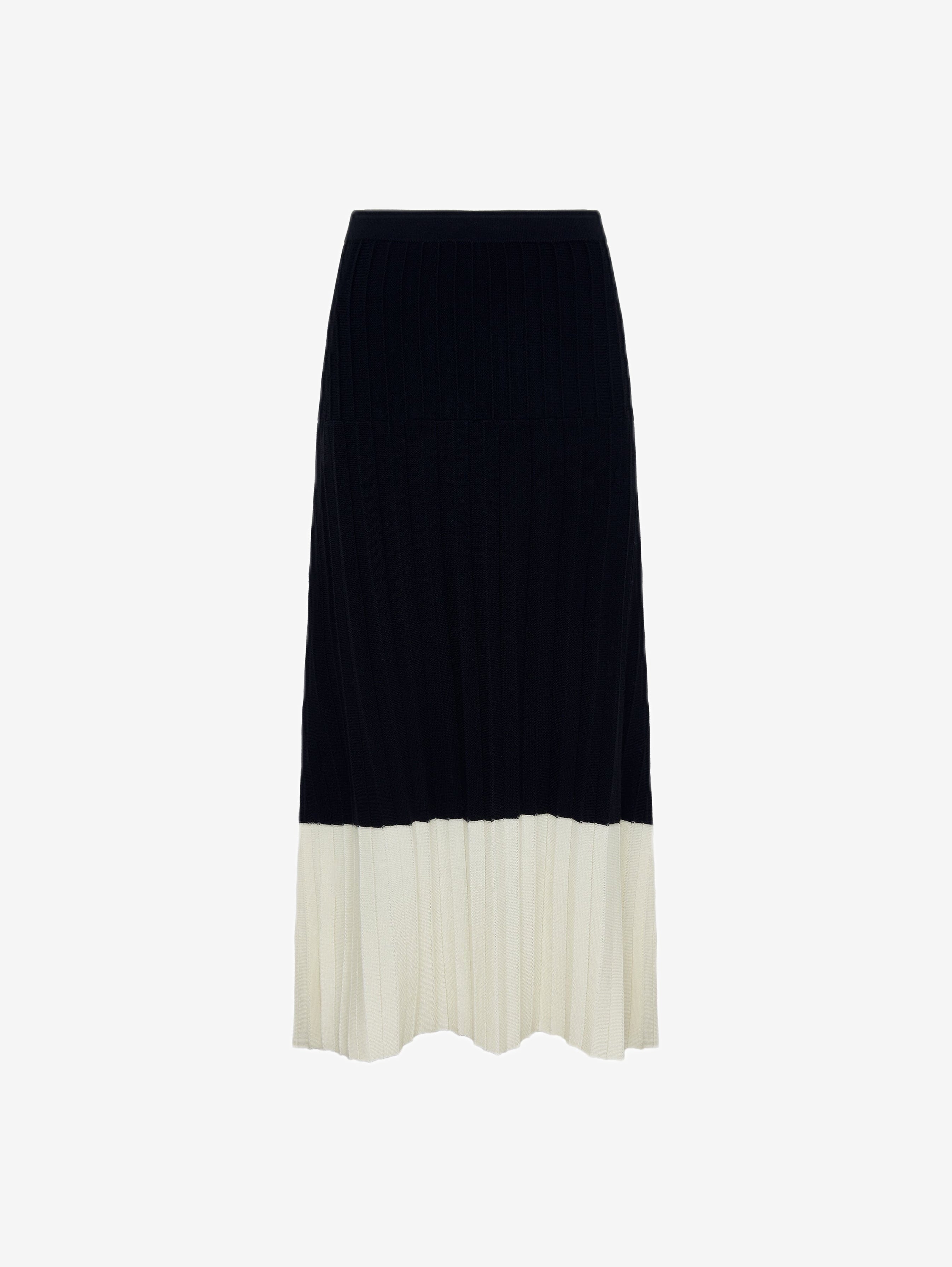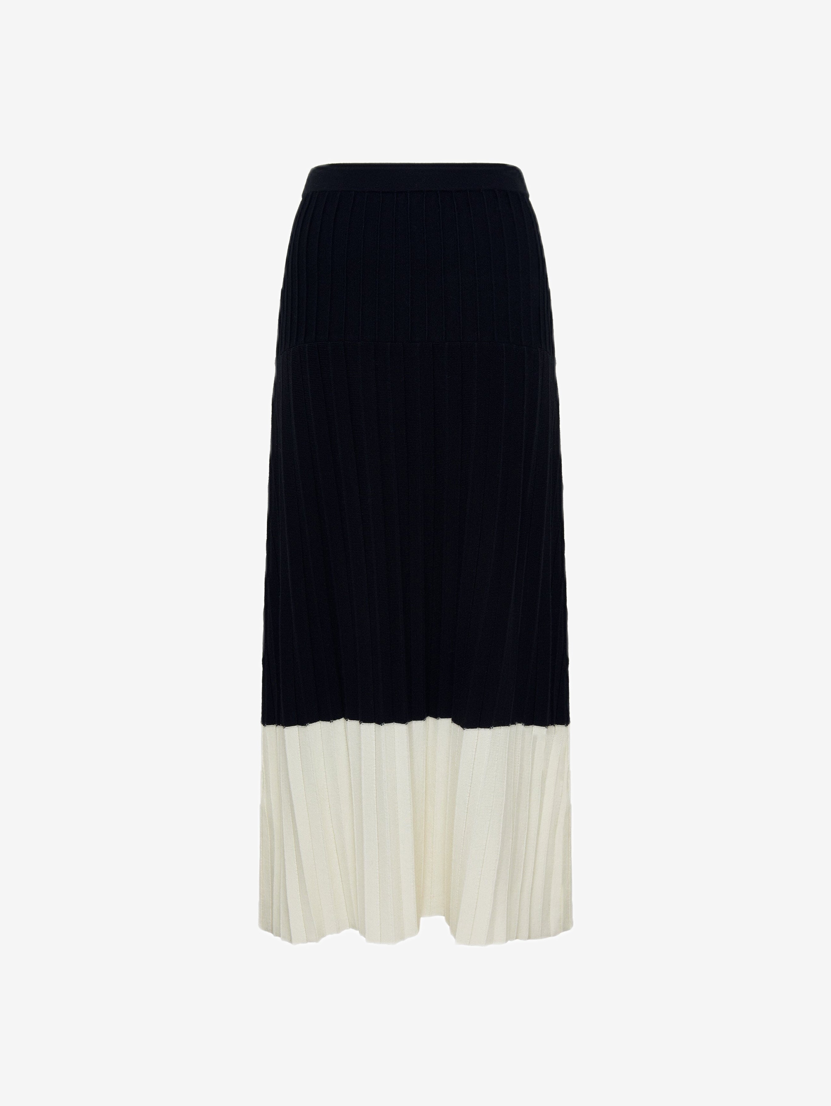 The Wool Skirt in Black brings sophistication and timeless style to your wardrobe. Crafted from 100% Australian Merino wool, this midi wool skirt features a two-tone pleated design with a striking cream contrast hem, adding modern elegance to a classic silhouette.
