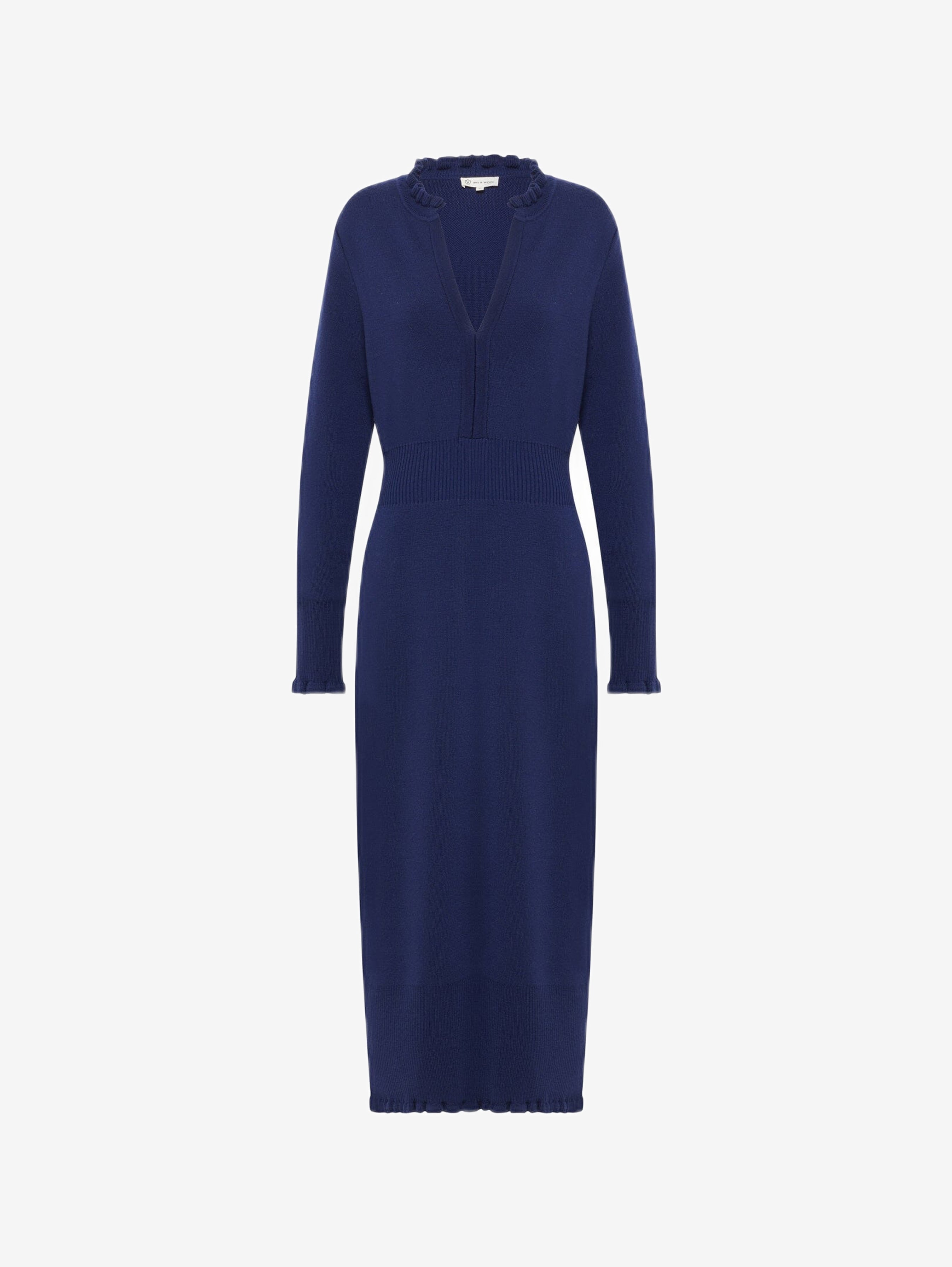 Sophisticated and effortlessly stylish, the Little River Knit Dress in Navy brings elegance to any wardrobe. This wool dress is designed in premium merino wool and adorned with delicate ruffles on the neckline and cuffs, creating a flattering silhouette that emphasizes the waist.