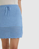 Embrace subtle charm with the Margot crochet mini skirt in sky blue, crafted from a premium wool and cotton blend. This blue crochet skirt features a soft jersey waistline with a drawstring, along with a crochet hem and scalloped edges for a touch of elegance. Pair this mini skirt with the Margot Sweater or a casual top for a fresh and versatile look. Available in sky blue, black, and cream.